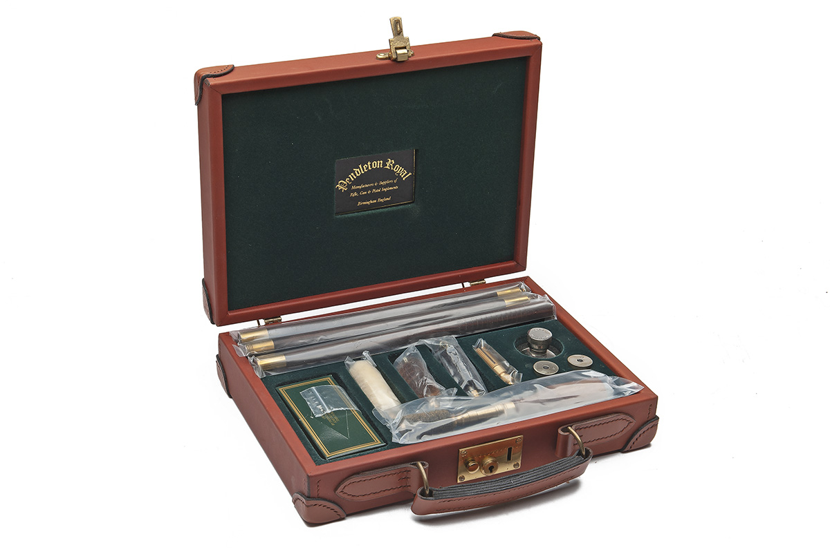 AN UNUSED LUXURY TAN LEATHER 'WINDSOR' 12-BORE GUN CLEANING KIT,