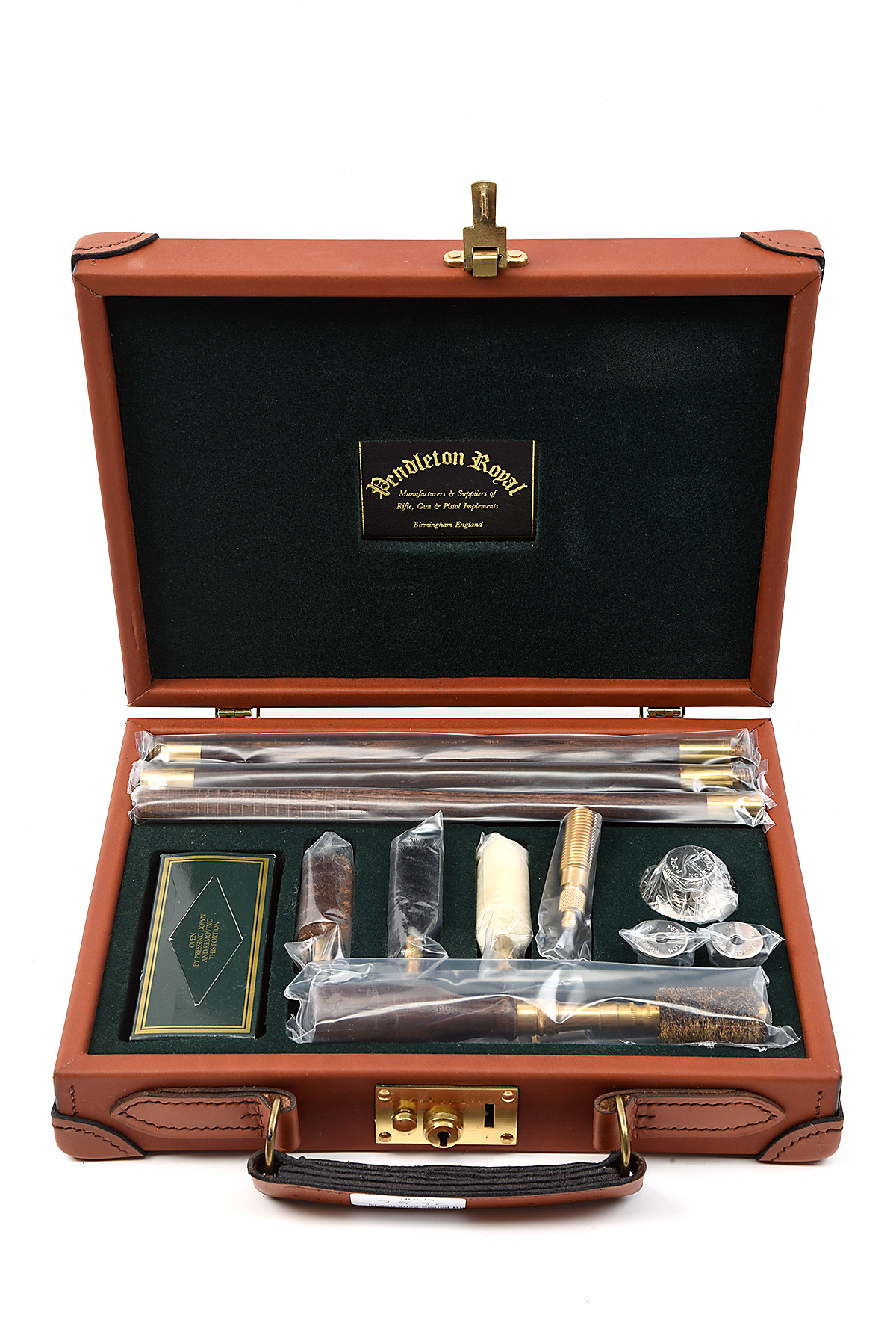 AN UNUSED PENDLETON ROYAL LUXURY TAN LEATHER 'WINDSOR' 12-BORE GUN CLEANING KITS with a green lined tray containing a 3-piece rosewood cleaning rod, brass jag, mop, bristle brush, phosphor bronze brush, dispenser of patches, nickel plated round oil flask, rosewood and nickel snap caps, rosewood chamber brush handle with a Payne Galway 12g chamber brush presented in a lined leather lockable Motor case with leather corners Size approx 13 x 9ins