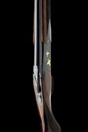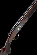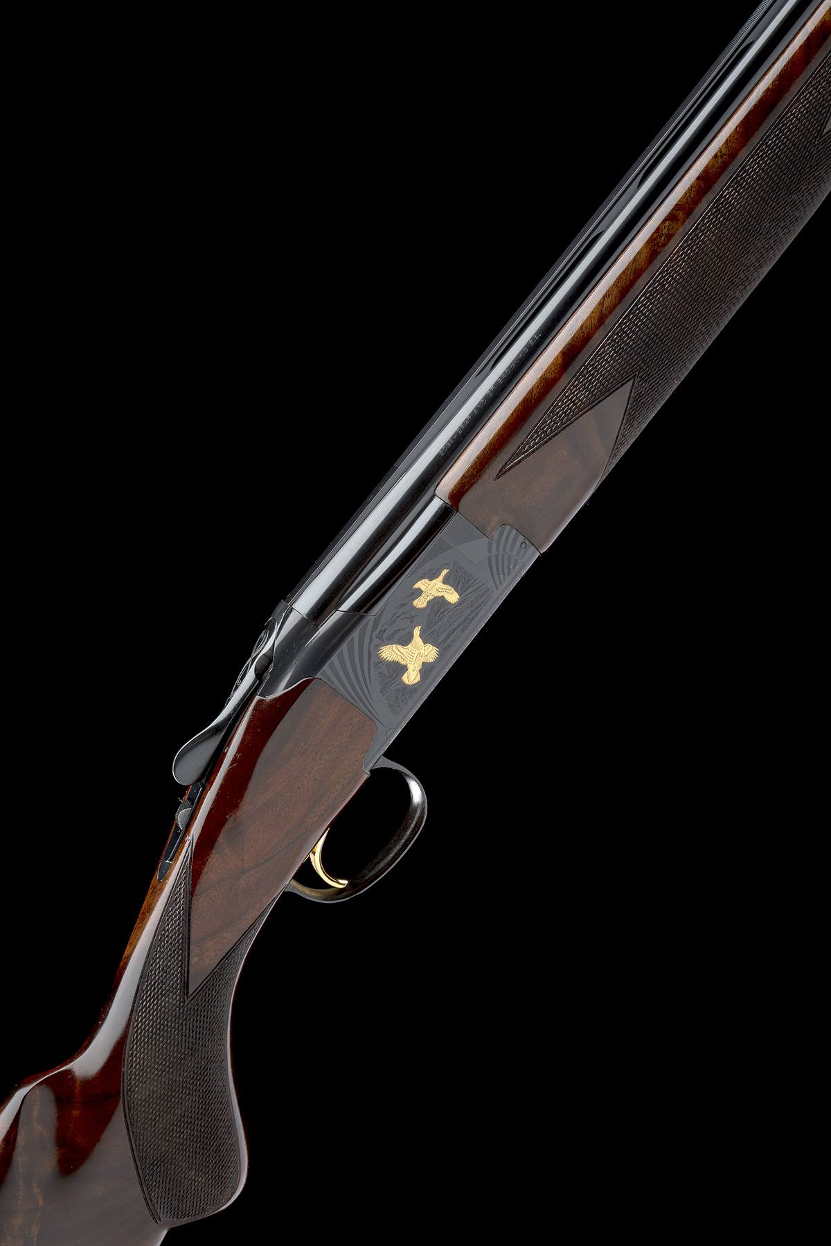 for 2014, 28in. nitro barrels with 6mm ventilated matt top-rib, 3in. chambers, multichokes (with spares), hold-open toplever, manual safety with integral barrel selector switch, gold-washed single trigger, blacked finish with gold-highlighted scenes of partridge in flight, the underside gold-inlaid with the model designation, 14 3/4in. semi-pistolgrip stock including 1/2in. rubber recoil pad, weight 6lb. 10oz., in its makers universal case with paperwork