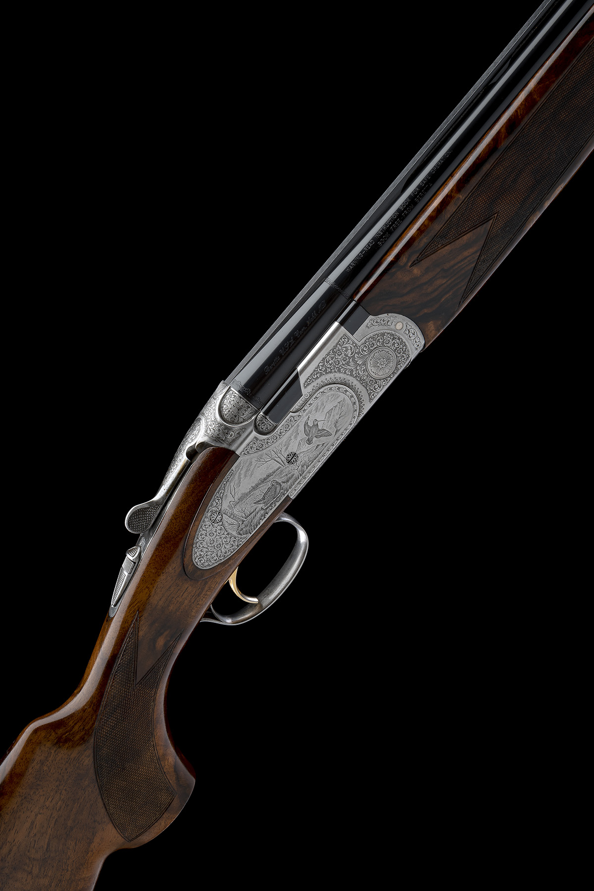 for 2001, 29 1/2in. nitro reproved barrels with 6mm ventilated matt top-rib, 3in. chambers, Teague multi-chokes (with spares), hold-open toplever, automatic safety with integral barrel selector switch, gold-washed trigger, floral and scroll engraving surrounding game scenes of woodcock and pheasant, the underside with the model designation, the triggerplate signed 'Bottega C. Giovanelli', 14 5/8in. figured pistolgrip stock including buttplate, weight 7lb. 3oz., in its universal case with paperwork