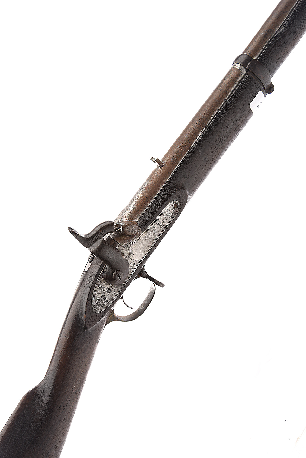* A .577 (SNIDER) SINGLE-SHOT SERVICE-RIFLE SIGNED TOWER, MODEL 'SNIDER THREE-BAND', no visible serial number, dated for 1871, with 36 3/4in. sighted barrel (some surface corrosion), flip-open breech, plain bar-action lock and walnut full-stock with brass furniture except three iron barrel-bands and jag-ended clearing rod