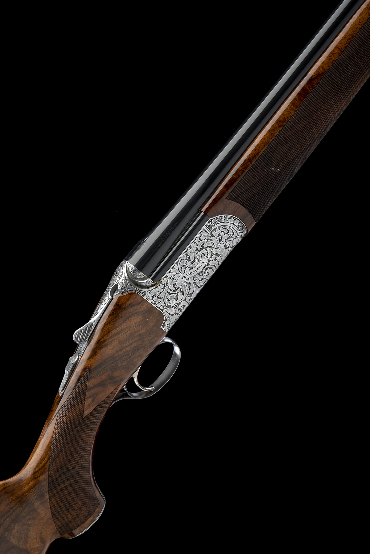 dated 2017, 30in. nitro ribless barrels, 3in. chambers, multichoke (with spares), hold-open toplever, automatic safety with integral barrel-selector switch, the action and triggerguard with bold acanthus scrollwork set against a matt background, bright finish, 14 3/4in. figured pistolgrip stock with engraved pistolgrip cap, weight 7lb. 4oz., in its makers compact case with some accessories and paperwork