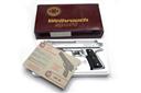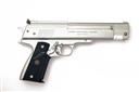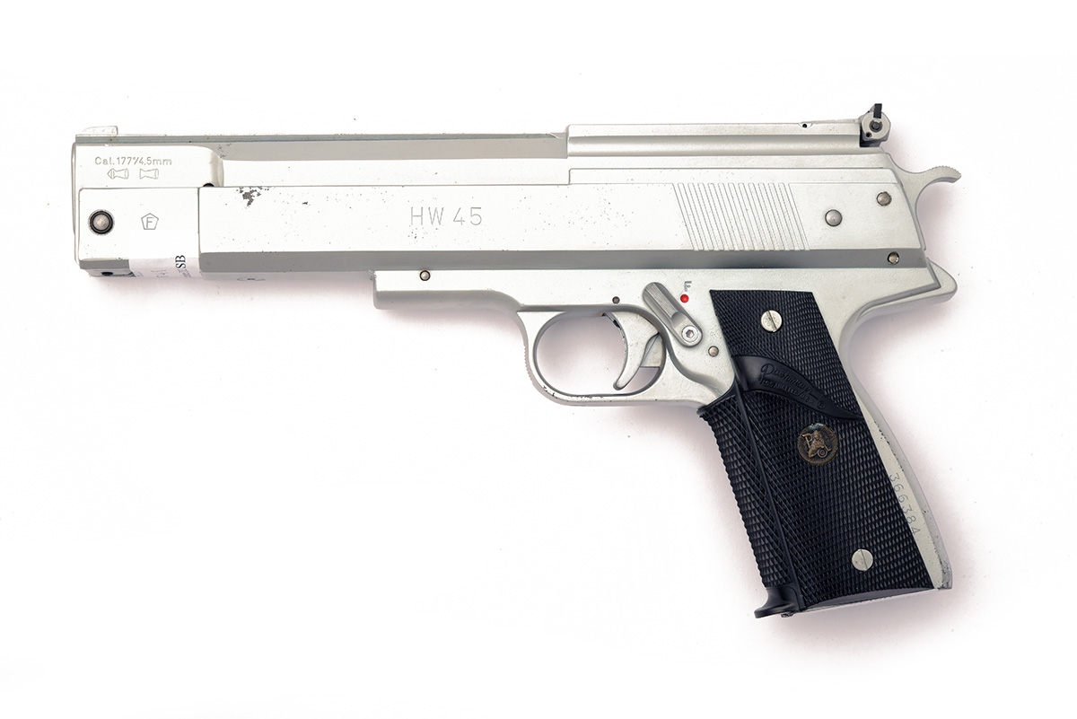 A BOXED .22 BARREL COCKING AIR PISTOL SIGNED WEIHRAUCH MODEL HW45 Serial no 366384 with a 6in. barrel, open sights, satin silver anodised frame and top slide with black Pachmayr grips. In manufacturers original box.
