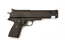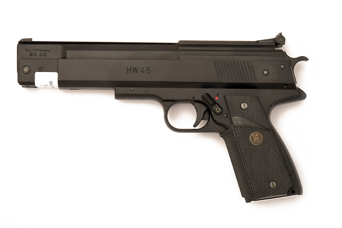 A BOXED .177 BARREL COCKING AIR PISTOL SIGNED WEIHRAUCH MODEL HW45 Serial no 375514 with a 6in. barrel, open sights, black anodised frame and top slide with black Pachmayr grips. In manufacturers original box.