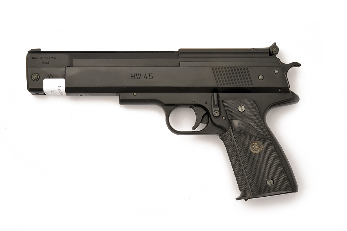 A BOXED .22 BARREL COCKING AIR PISTOL SIGNED WEIHRAUCH MODEL HW45 Serial no 379573 with a 6in. barrel, open sights, black anodised frame and top slide with black Pachmayr grips. In manufacturers original box.