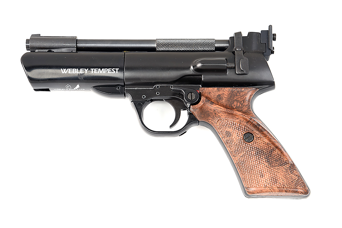 A BOXED .22 BARREL COCKING AIR PISTOL SIGNED WEBLEY MODEL TEMPEST No visible serial number. with a 7in. barrel, open sights, side safety, alloy and composite body with abs wood effect grips.