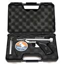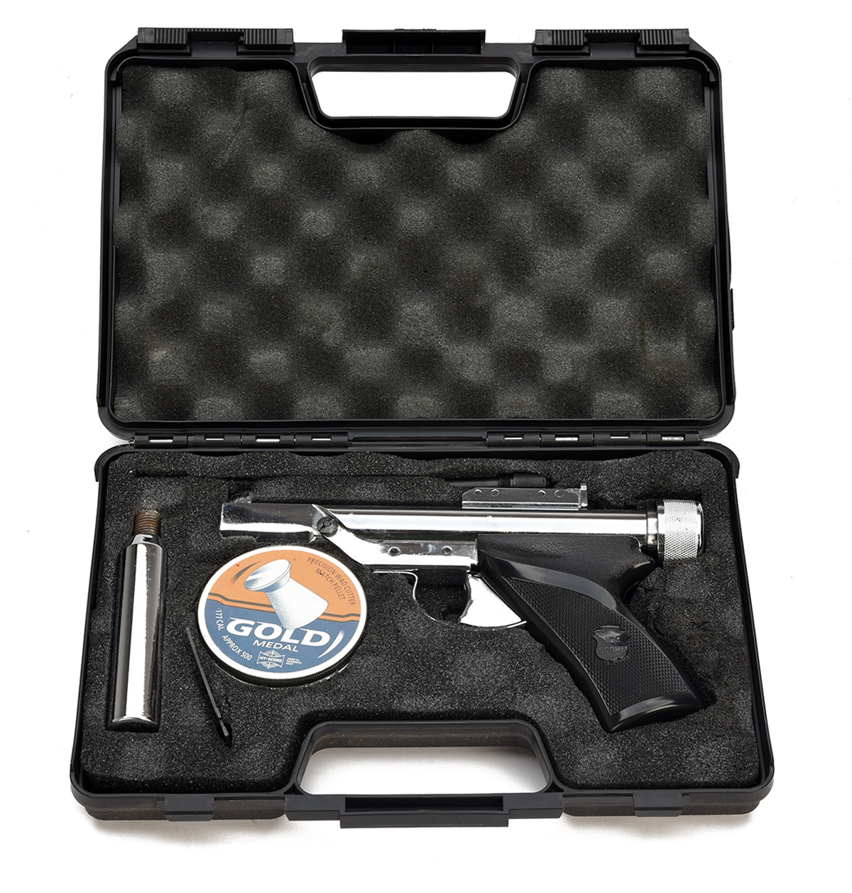 A SCARCE CASED CHROMED HY-SCORE SPORTER .177 & .22 AIR-PISTOL KIT, no visible serial number, later Phoenix arms production, with two 7 1/2in. barrels, polished chrome finish and black plastic chequered grip, in its abs plastic carry case with accessories (foam lining starting to perish)