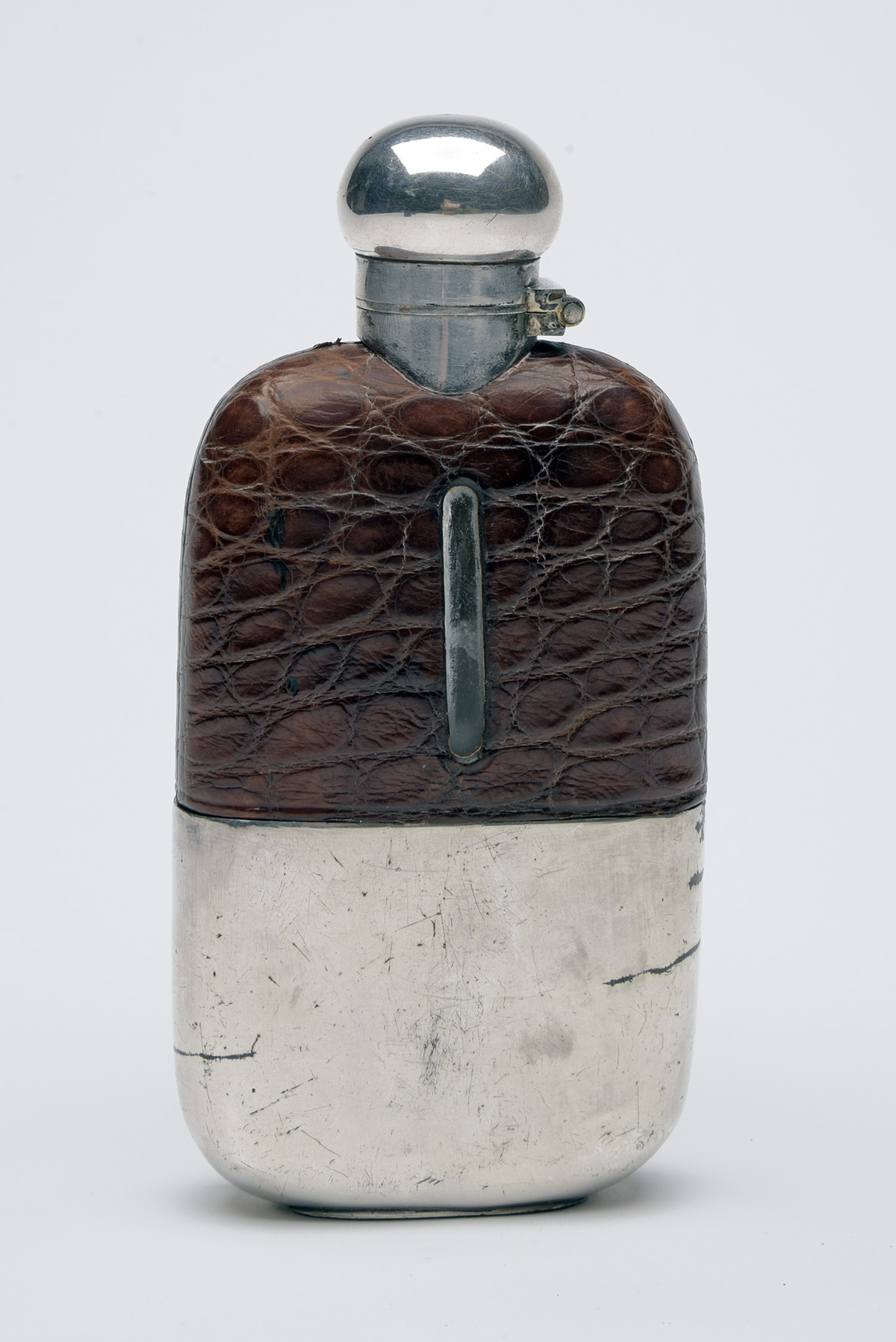 A VINTAGE HALF LEATHER-BOUND DRINKING FLASK WITH DETACHABLE FITTED CUP,