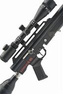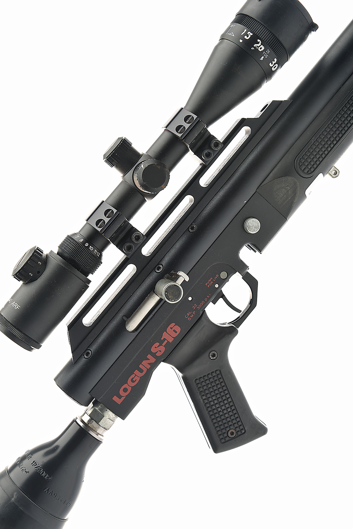 A .22 PRE-CHARGED PNEUMATIC AIR-RIFLE, SIGNED LOGUN 'MODEL S-16', serial no. 11867, 23 1/2in. barrel including sound moderator, receiver with raised rail and fitted with an IR 3-12x40 ARF telescopic sight, manual push-button safety, magazine missing, black rubberised grip, rear buddy bottle acting as stock, untested