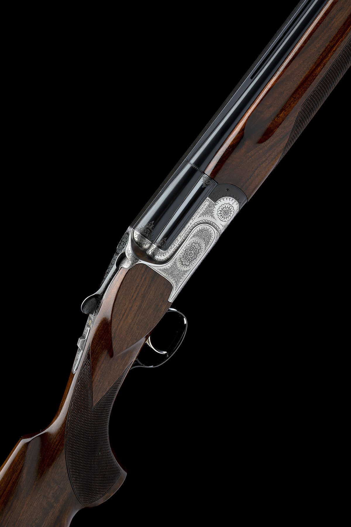 for 1997, full Spanish code 16-03-367-97, 28in. nitro barrels with tapered ventilated matt top-rib and muzzle end mid-rib, 2 3/4in. chambers, multichokes (no spares), stiff to open, manual safety with integral barrel selector switch, bouquet and acanthus scroll engraving, bright and blued finish overall, 14 7/8in. figured semi-pistolgrip stock including 7/8in. rubber recoil pad, weight 7lb. 14oz.