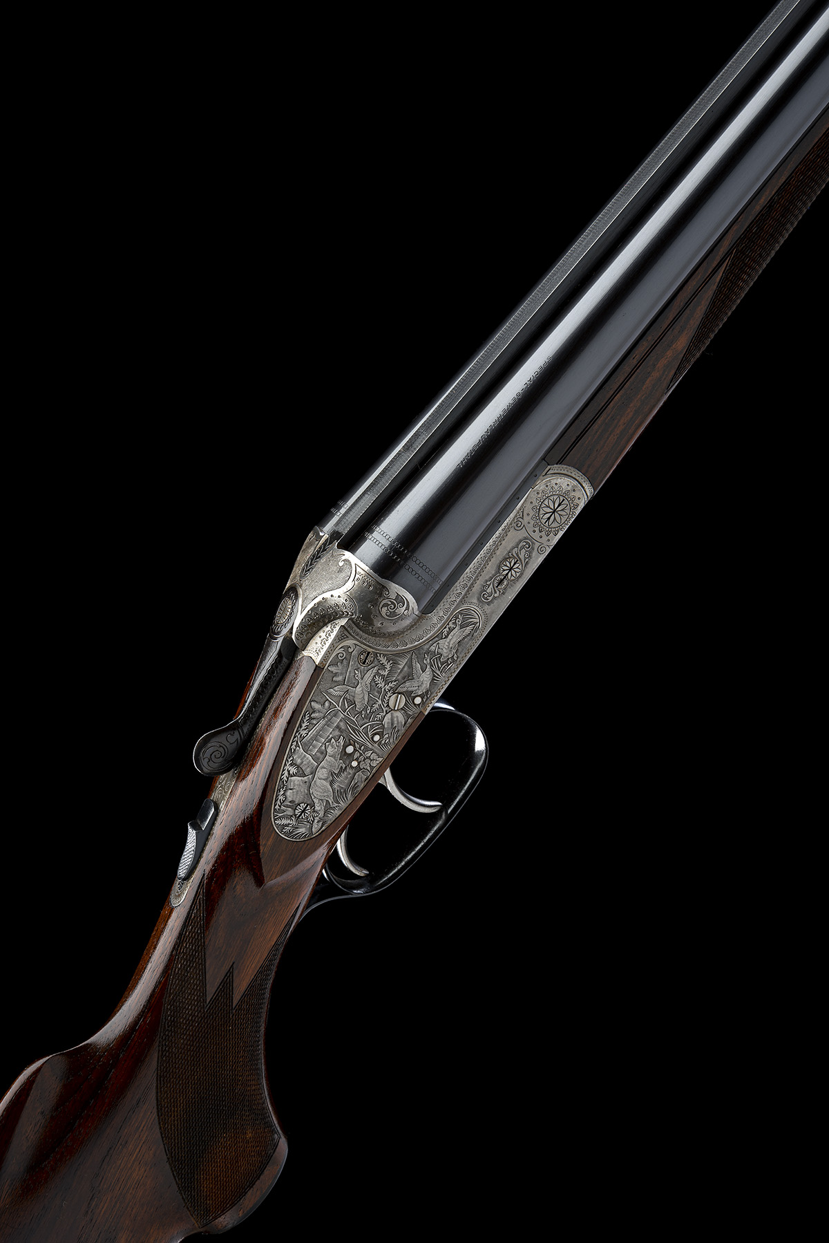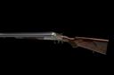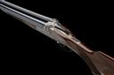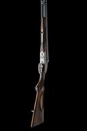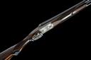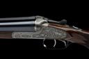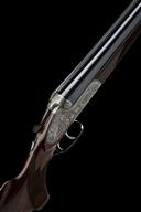 for 1984, 28in. nitro barrels with matt rib, 2 3/4in. chambers, bored approx. 3/4 and full choke, bolstered treble-grip action with sideclips, automatic safety, cocking-indicators, border and acanthus scroll engraving, the lockplates carved in relief with scenes of hound flushing game in a woodland setting on the left, the right with scenes of fox with and duck, old silver finish, 1 1/2in. pistolgrip stock with cheekpiece, sling swivels and including buttplate, weight 7lb. 3oz., in leather slip