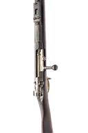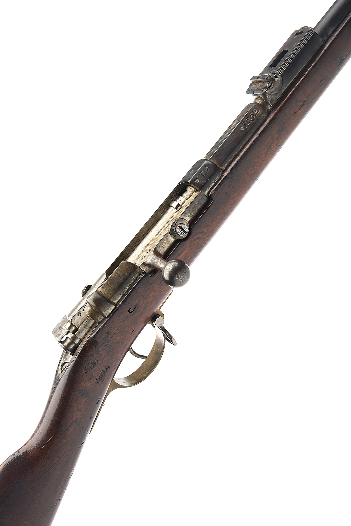 with 33 1/2in. barrel with block and blade front-sight, rear-sight with one fixed blade, one battle hinged leaf and an elevating ladder, the breech profusely stamped with German ordnance marks, iron mounted full walnut stock including three barrel bands top band with bayonet lug, the butt bearing various inspection stamps, the rifle is complete with sling swivels and original rod, miss-matched bolt, barrel to a grey / brown patina.
