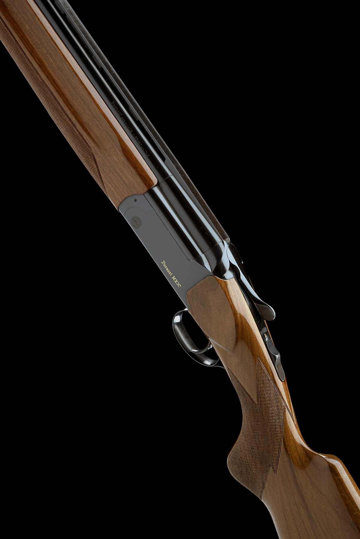 dated 1985, 29 3/4in. nitro barrels with 11mm ventilated matt top-rib and no mid-rib, 2 3/4in. chambers, multichoke (no spares), hold-open toplever, manual safety with gold-inlaid 'S' detail and with integral triggerplate release catch, non-selective single-trigger, blacked action with gold-inlaid 'PERAZZI MX3C', 14 1/4in. semi-pistolgrip stock including 3/4in. rubber recoil pad, weight 8lb. 1oz.