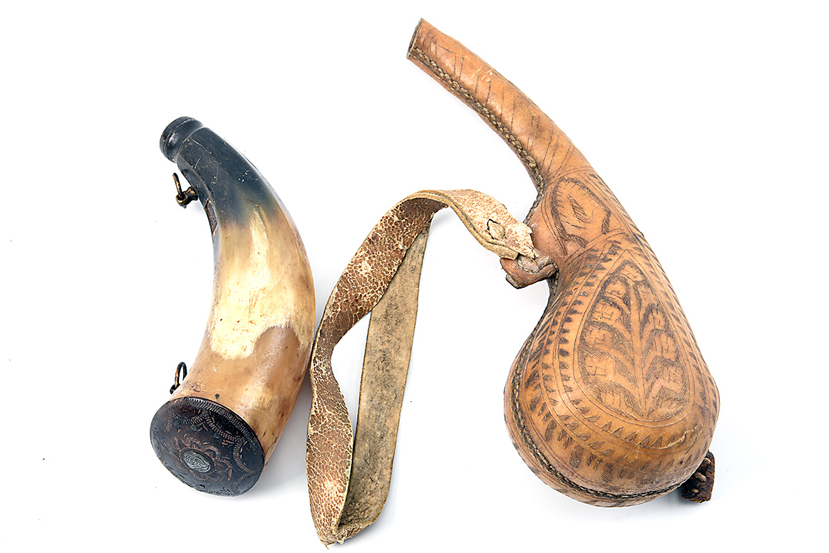 A PAIR OF VINTAGE NORTH AFRICAN POWDER FLASKS, early 20th Century, one tooled leather camel scrotum, 9 in. overall; one horn with carved wooden base and white metal centre with two brass suspension rings, base chipped and missing plug