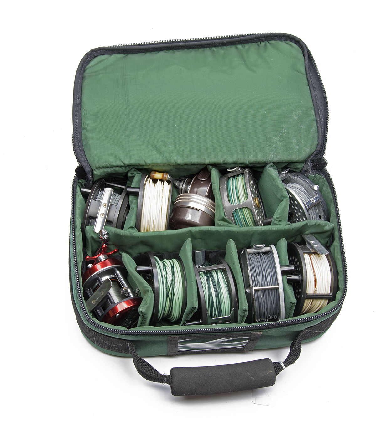 A GREEN APEL BAG CONTAINING A COLLECTION OF TEN SALMON FISHING REELS,