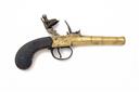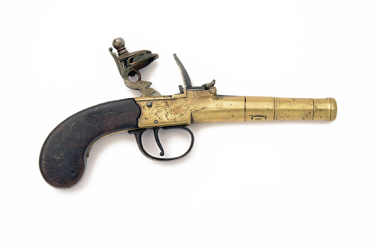 A 40-BORE FLINTLOCK BRASS CANNON-BARRELLED POCKET-PISTOL SIGNED BARBER, no visible serial number, circa 1785, with banded turn-off 2 1/2in. barrel, signed and engraved squared action with central cock and trigger guard bow safe, slab-sided walnut butt, the whole heavily cleaned with some loss to detail