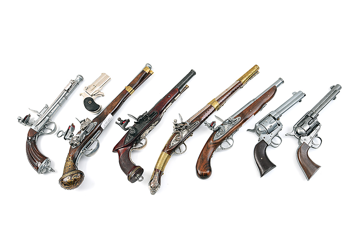 A GROUP OF EIGHT DIE-CAST INERT DISPLAY-ONLY ANTIQUE-TYPE PISTOLS, including five flintlock styles, one derringer and two revolvers, VCR Bill exempt through depicted design date, small faults and losses to some
