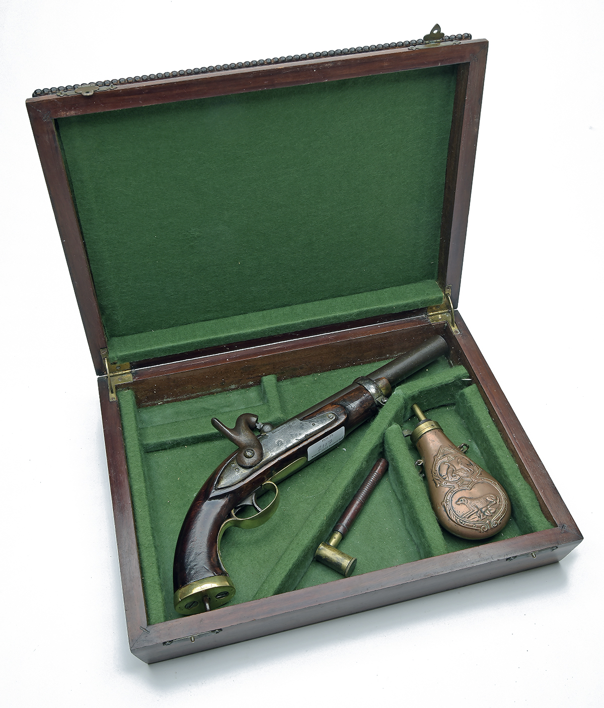 A .690 PERCUSSION HOLSTER-PISTOL, UNSIGNED, no visible serial number, probably a marriage of parts for the tourist market, with French style barrel with off-centre nipple, French type lock converted from flint and marked with a Turkish Tughra in an oval stamp, walnut half-stock with English Lancer's style butt, brass furniture except single iron barrel-band, no provision for ramrod, in a later wood case with reproduction flask and powder measure