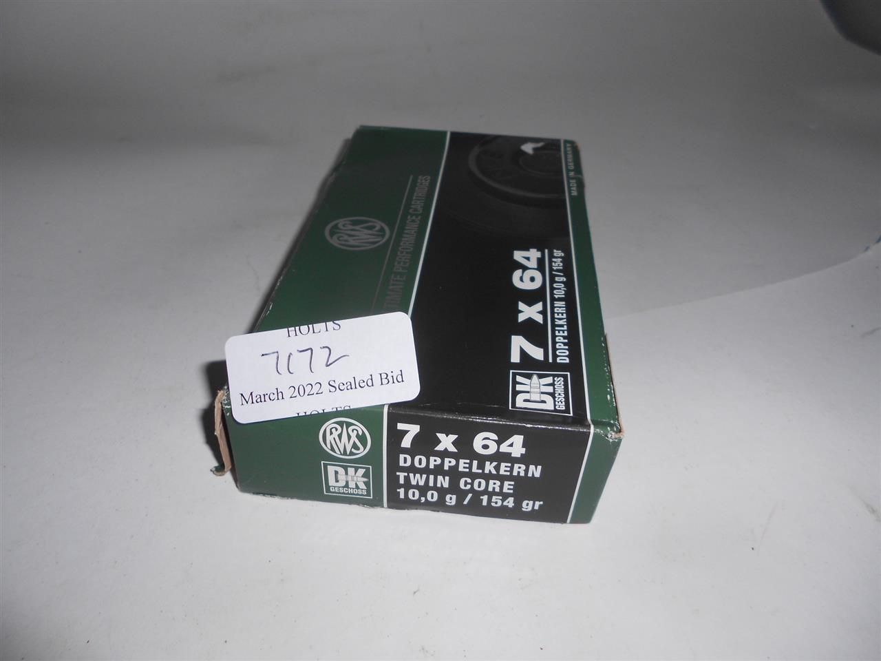 20 ROUNDS 7 x 64 TWIN CORE RWS AMMUNITION, 154grn Please be advised that cartridges/ammunition, primers, primed cases, blanks and percussion caps cannot be sent to you by post or carrier. If you wish, you can book a collection at one of our regional valuation days, or collect from our offices at PE31 6HA in Norfolk