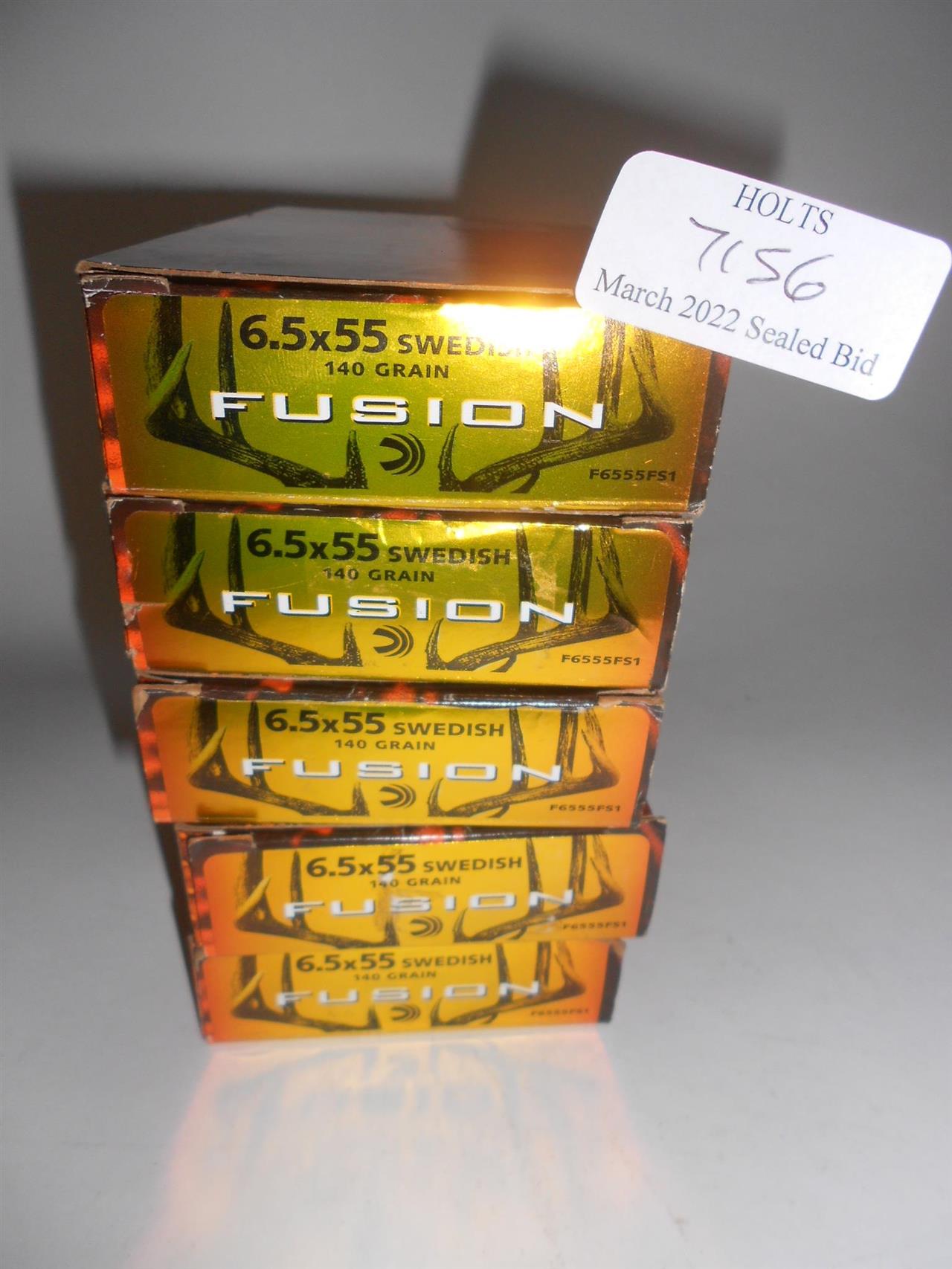 100 6.5 x 55mm SWEDISH AMMUNITION BY FUSION, 140grn. PATENTED FUSION PREDATOR BULLET Please be advised that cartridges/ammunition, primers, primed cases, blanks and percussion caps cannot be sent to you by post or carrier. If you wish, you can book a collection at one of our regional valuation days, or collect from our offices at PE31 6HA in Norfolk