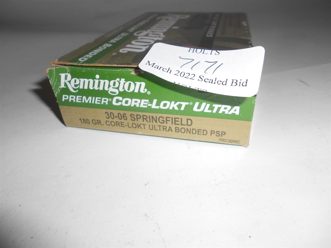 14 ROUNDS .30-06 SPRNG AMMUNITION BY REMINGTON, 180grn. PREMIERE CORE-LOKT ULTRA BONDED PSP, #PRC3006C Please be advised that cartridges/ammunition, primers, primed cases, blanks and percussion caps cannot be sent to you by post or carrier. If you wish, you can book a collection at one of our regional valuation days, or collect from our offices at PE31 6HA in Norfolk