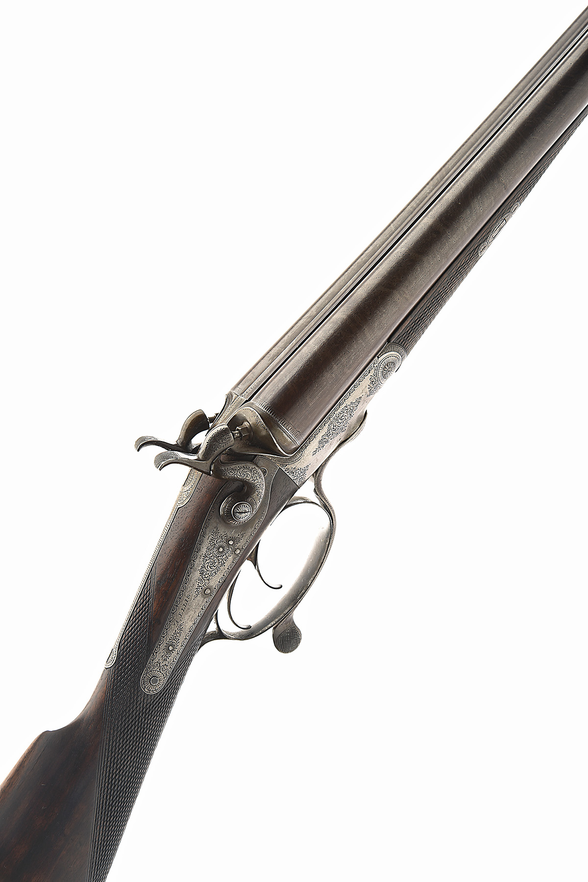 A. ELLIS 12-BORE ROTARY-UNDERLEVER HAMMERGUN, no visible serial number, circa 1870, 30in. nitro reproved bold twist barrels, the rib engraved 'A. ELLIS EXETER', 2 1/2in. chambers, true cyl. in both, Jones patent rotary underlever, carved percussion fences, non-rebounding back-action locks, border and scroll engraving, 14 3/8in. figured stock including steel buttplate, fore-end wood with repairs, weight 7lb. 2oz., in a case
