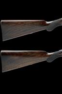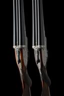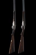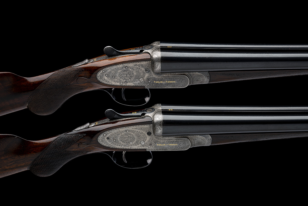 circa 1927, 29in. nitro chopperlump barrels, the ribs gold-inlaid '1' and '2' at the breech ends, the tubes engraved 'CHARLES LANCASTER. 99. MOUNT STREET BERKELEY SQUARE LONDON.', 2 1/2in. chambers, bored approx. true cyl. and 1/4 choke, some pits No.1, slender W. Baker patent assisted-opening actions, patent no. 16778 of 22nd March 1913, with Baker patent ejectors, slender fences, removable striker discs, toplevers gold-inlaid '1' and '2', automatic safeties with gold-inlaid 'SAFE' details, cocking-indicators, non-selective single triggers, fine acanthus scroll engraving with floral bouquets, the lockplates gold-inlaid 'TWELVE - TWENTY', the undersides with a scrolling banners gold-inlaid 'CHARLES LANCASTER LONDON', traces of finish, 15 1/2in. replacement semi-pistolgrip stocks cast on for the left shoulder, fore-end wood No.2 with repairs, dovetailed insert repair and scratch chequering, weight 6lb. 3oz. (No.1) and 6lb. 5oz. (No.2)