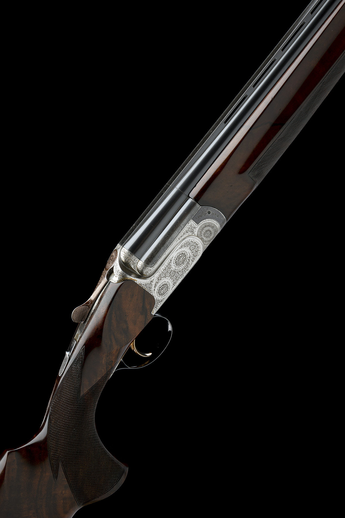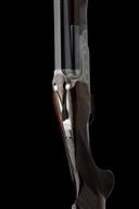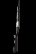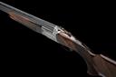 for 1972, 30in. nitro reproved barrels with 11mm file cut ventilated top-rib, 2 3/4in. chambers, multichokes (with spares), hold-open toplever, manual safety with integral triggerplate release catch, gold-washed trigger, fine acanthus scroll engraving with floral bouquets, bright finish, 14 7/8in. figured replacement pistolgrip stock with left hand palm swell and cast on for the left shoulder (small cracks to stock to rear of triggerplate), including 1/2in. recoil pad, weight 8lb. 4oz., in a universal case, together with original pistolgrip stock (crack at hand) and fore-end wood