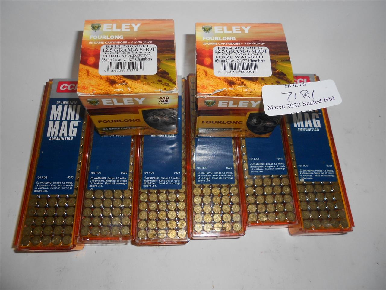 600 ROUNDS .22LR MINI-MAG BY CCI, COPPER COATED SOLID, WITH 50 .410 SHOTGUN CARTRIDGES, 65mm, 6 SHOT, FIBRE WAD Please be advised that cartridges/ammunition, primers, primed cases, blanks and percussion caps cannot be sent to you by post or carrier. If you wish, you can book a collection at one of our regional valuation days, or collect from our offices at PE31 6HA in Norfolk