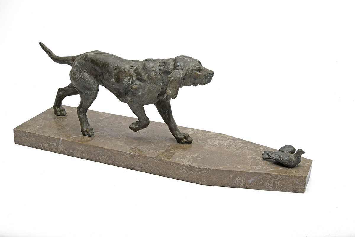 A BRONZE SCULPTURE OF A HOUND AND GROUNDED PIGEON