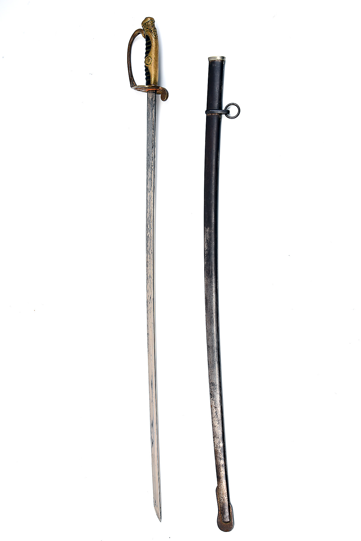 A JAPANESE WORLD WAR II ARMY OFFICER'S KYU-GUNTO DRESS SWORD, circa 1940, with steel 29in. single-edged nickelled steel blade with clipped point, decorated brass hilt and knuckle-guard, black plastic grips bound with brass wire, together with its steel scabbard with single suspension loop, worn, scabbard stained with rusting on the drag, 35 1/2in. overall