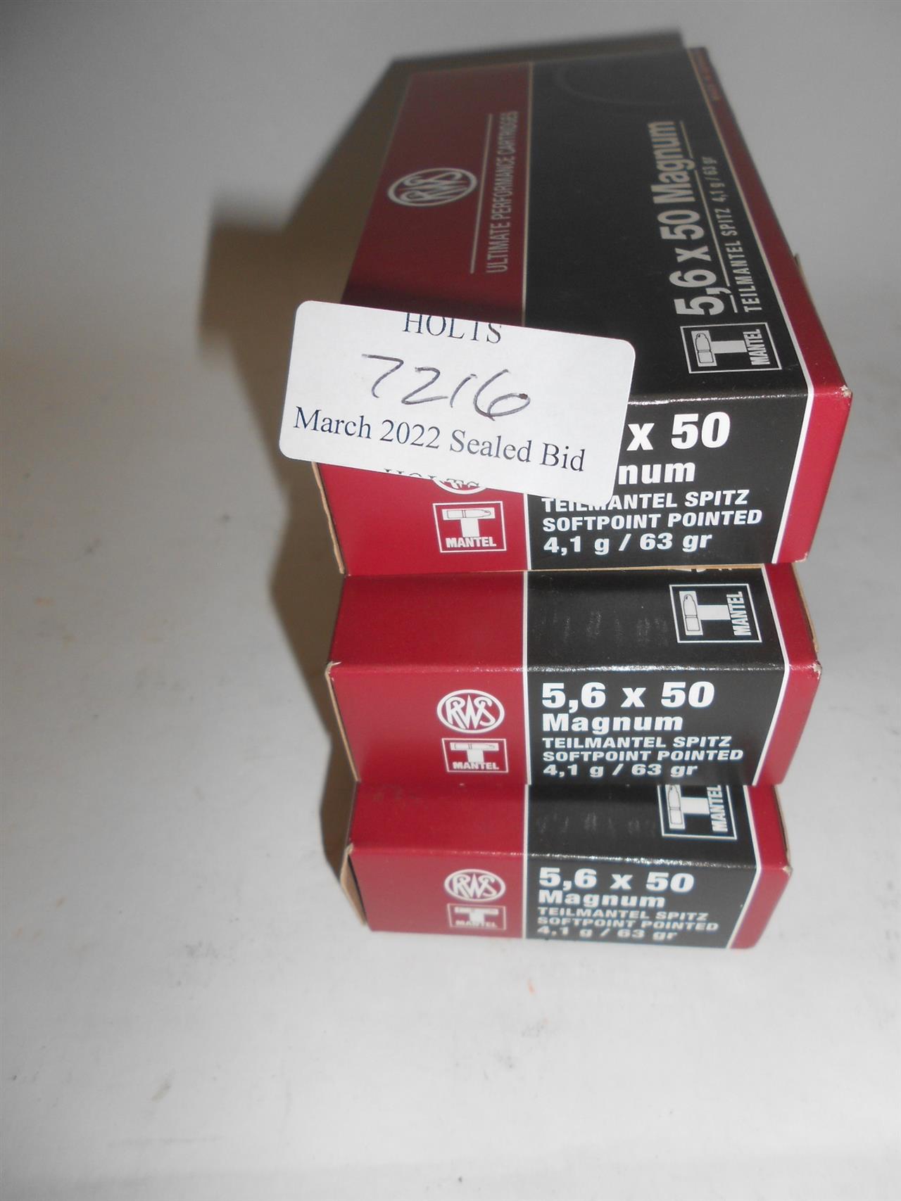 60 ROUNDS 5.6 X 50 AMMUNITION BY RWS, 63grn, SP Please be advised that cartridges/ammunition, primers, primed cases, blanks and percussion caps cannot be sent to you by post or carrier. If you wish, you can book a collection at one of our regional valuation days, or collect from our offices at PE31 6HA in Norfolk