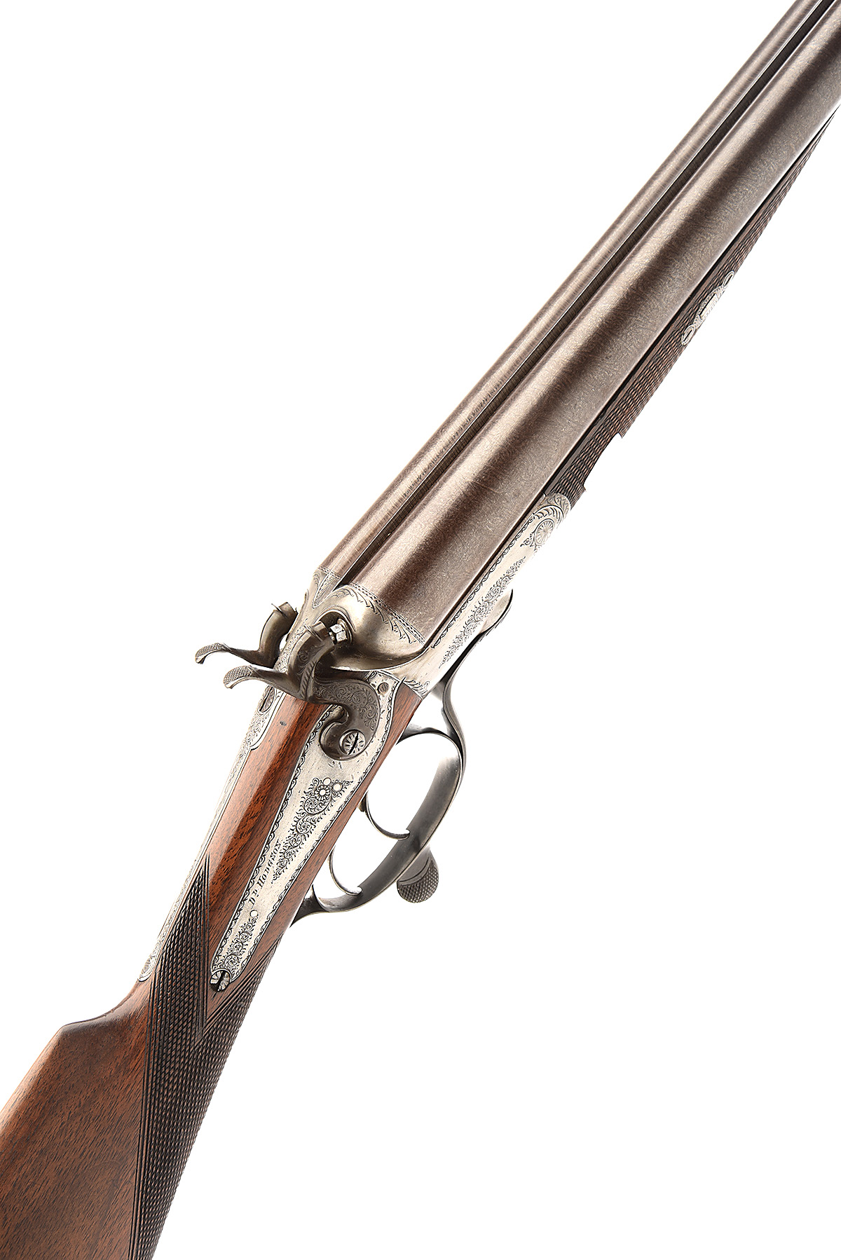 D. HODGSON 10-BORE (2 5/8IN.) ROTARY-UNDERLEVER HAMMERGUN, n.v.s.n., circa 1870, 32in. nitro reproved damascus barrels, rib engraved 'DD HODGSON. MAKER. RIPON.', Jones patent rotary underlever, carved percussion fences, rebounding locks, border and partial scroll engraving, 14 1/4in. stock with engraved steel heel and toe plates, weight 8lb.