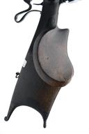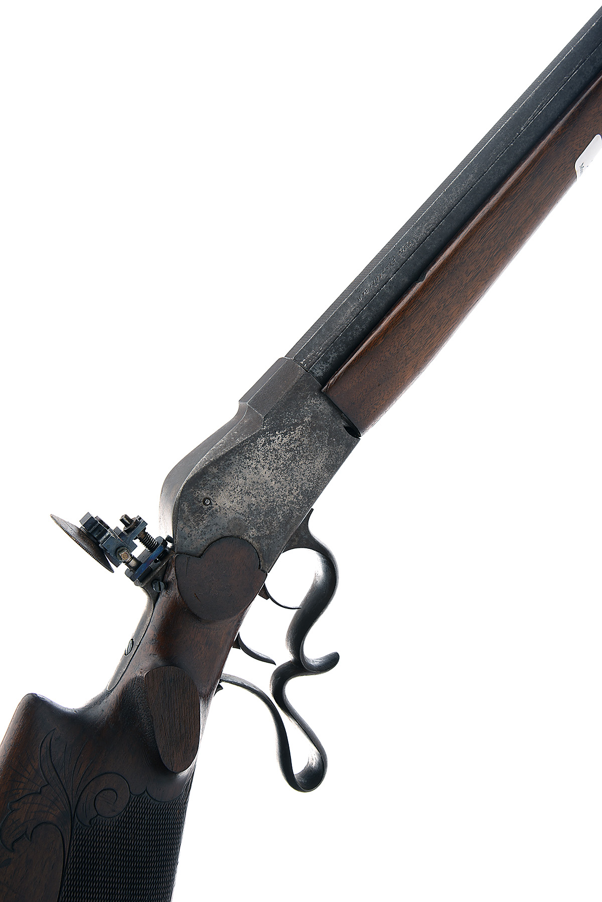 A 4mm (ZIMMER) RIMFIRE TARGET RIFLE SIGNED PHIL ERNSTBERGER, TIRSCHENREUTH, no visible serial number, German circa 1920, with heavy 27in. octagonal 'barrel', the front 7 3/4in. housing the Zimmer mechanism, the mechanism loaded via an external lever mounted back from the muzzle, protected fore-sight, no provision for rear-sight, micro-adjustable pan-head peep-sight mounted to the top-tang, chequered walnut butt-stock with Tyrolean cheek-piece and heavy Swiss-style heel-plate, decorative chequered panel to the right side of butt, replacement fore-end, complex finger-grooved trigger guard bow acting as the cocking lever, double set triggers and swivels for sling
