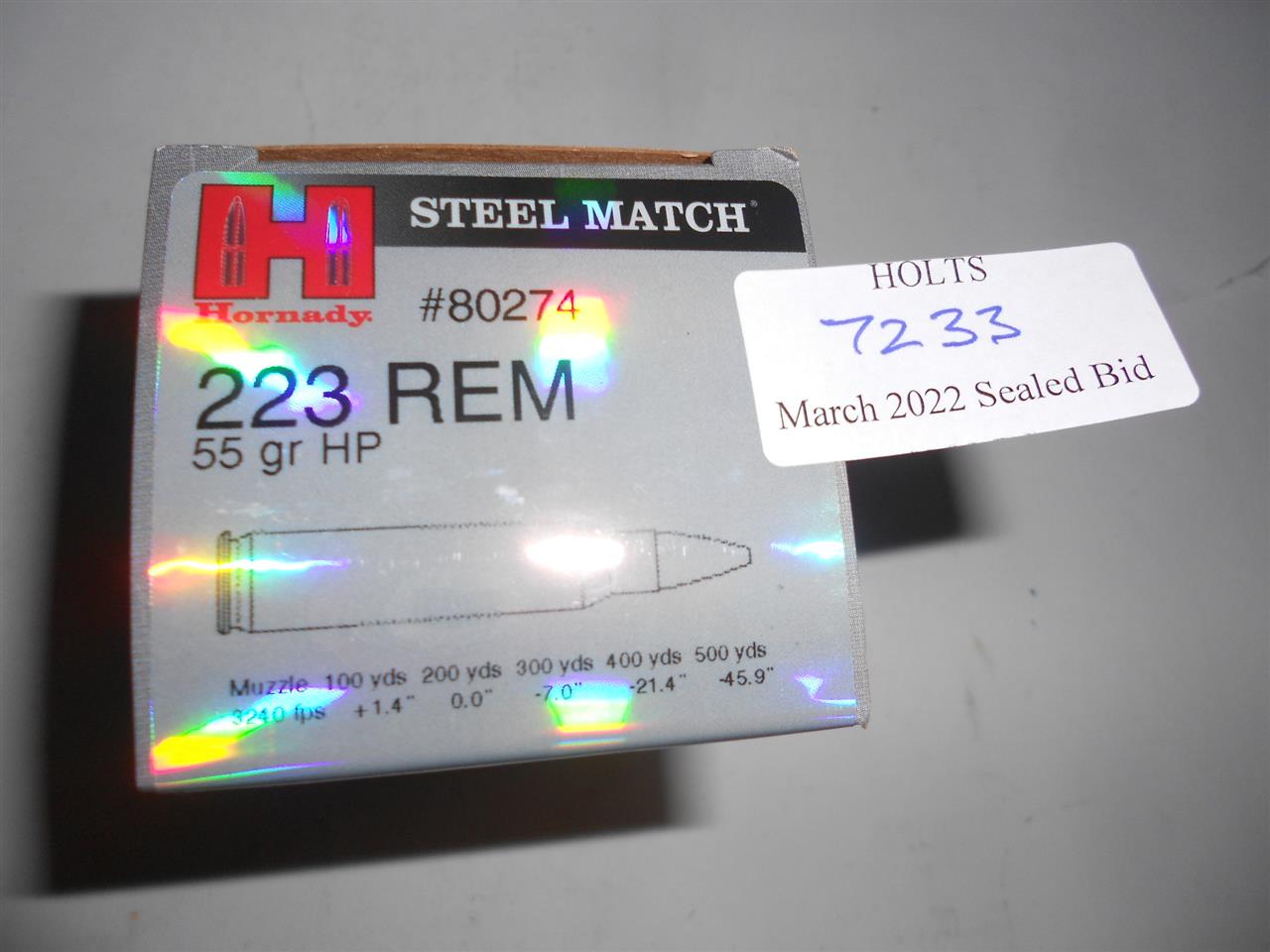 50 ROUNDS .223 REM STEEL MATCH AMMUNITION BY HORNADY, 55grn HP #80274 Please be advised that cartridges/ammunition, primers, primed cases, blanks and percussion caps cannot be sent to you by post or carrier. If you wish, you can book a collection at one of our regional valuation days, or collect from our offices at PE31 6HA in Norfolk