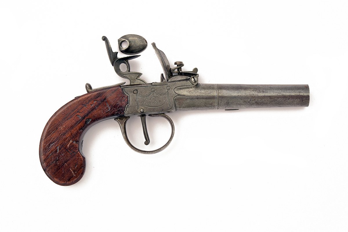 A 54-BORE FLINTLOCK POCKET-PISTOL SIGNED WHEELER, no visible serial number, circa 1800, with round turn-off 2 1/2in. barrel, squared action engraved with swags and signed 'WHEELER, LONDON', london proofs, central cock and frizzen (top-jaw screw absent but top-jaw present), sliding safe and slab-sided walnut butt