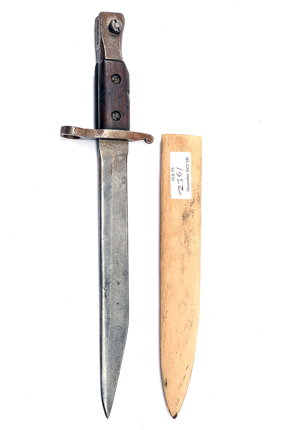 A CANADIAN WORLD WAR I PATTERN 1907 BAYONET FOR THE MARK II ROSS RIFLE, dated 1916, with 10 in. single-edged steel blade, steel cross-guard and hilt, stamped 'ROSS RIFLE CO / QUEBEC / PATENTED 1907' with inspection marks and 2/16 over, wooden grips, together with an associated wooden scabbard, worn, hilt with surface rust, 15 in. overall