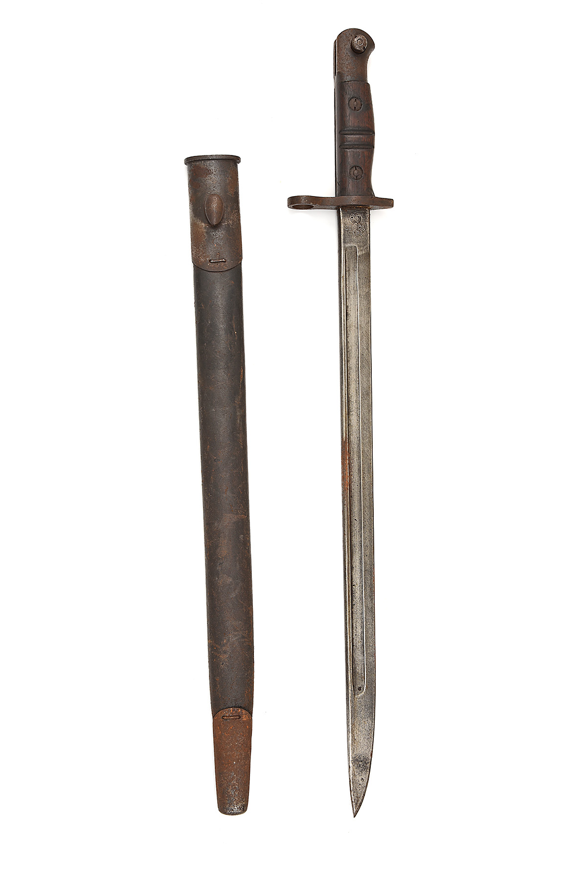 A UNITED STATES MODEL 1913 REMINGTON SWORD BAYONET FOR THE BRITISH ARMY, dated 10.17, with 17in. single-edged steel blade fullered on each side, ricasso marked '1913 / 10. 17 / REMINGTON', with scored through inspection marks over, steel cross-guard and hilt with wooden grips, together with its black leather scabbard stamped 'J.W.B.' with steel fittings, exposed steel rusted, scabbard leather solid with no splits, 23in. overall