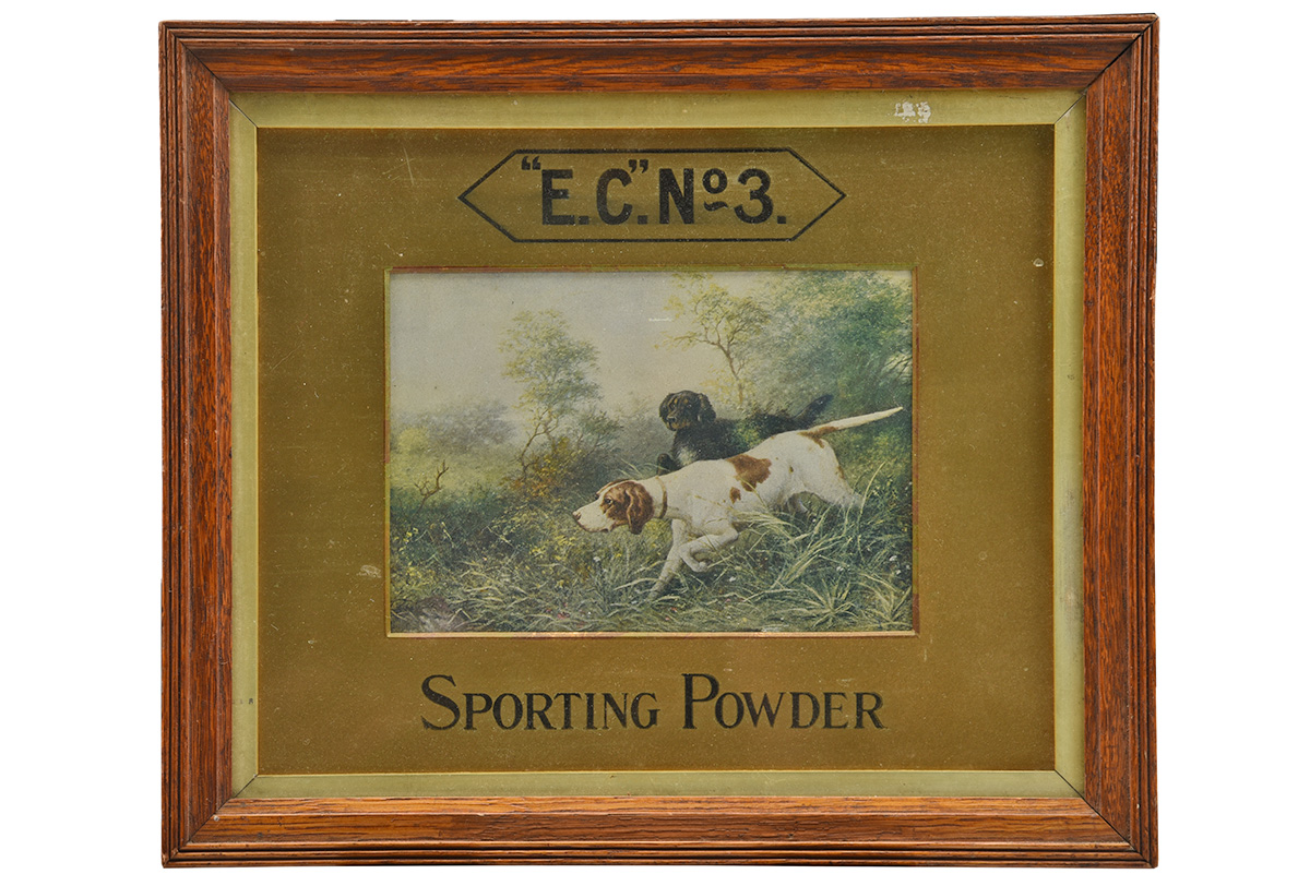 A RARE FRAMED & GLAZED ADVERTISING PRINT FOR 'E.C.' No.3 POWDERS, circa World War One, measuring 13 1/2in. x 11 1/2in. in its original wood frame, the central print of a pair of springer spaniels, the mount stating 'E.C. No.3' over 'SPORTING POWDERS'