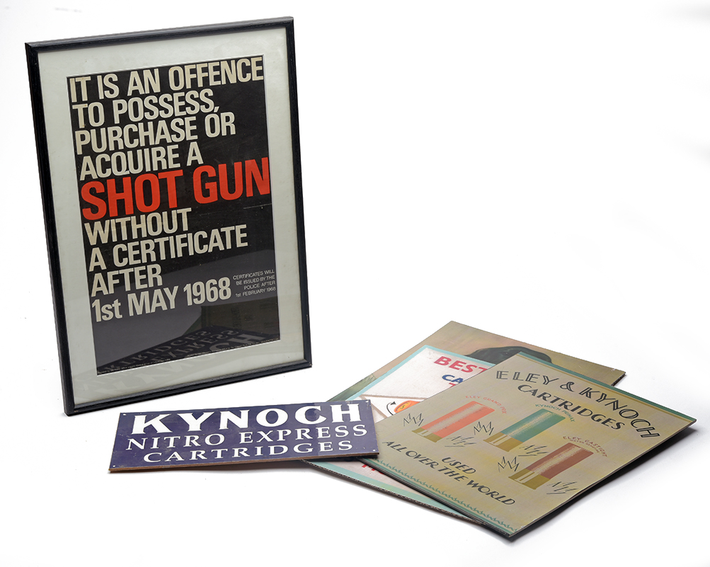 A FRAMED AND GLAZED POSTER ANNOUNCING THE 1968 LAW CHANGES FOR SHOTGUN OWNERSHIP IN THE UK, TOGETHER WITH FOUR REPRODUCTION ADVERTS, the first original, the frame measuring 17 1/2in. x 13in., the remainder including 'KYNOCH NITRO EXPRESS CARTRIDGES', 'PAGE-WOOD CARTRIDGES', 'ELEY-KYNOCH CARTRIDGES' and 'ELEY & KYNOCH CARTRIDGES', all copied from original designs