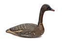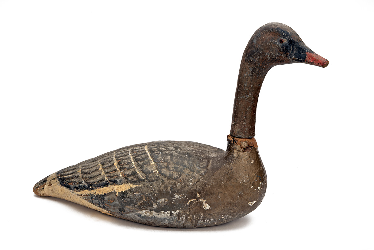 A UNITED STATES "CARRY-LITE" PAPIER-MACHE GOOSE DECOY, 1950s-1960s, life-size grey goose of moulded paper, the base marked 'CARRY / LITE', the head and neck separates from the body, damage around the neck joint and a 11/2 in. diameter dent to the left side, losses to the end of the bill but a rare survivor