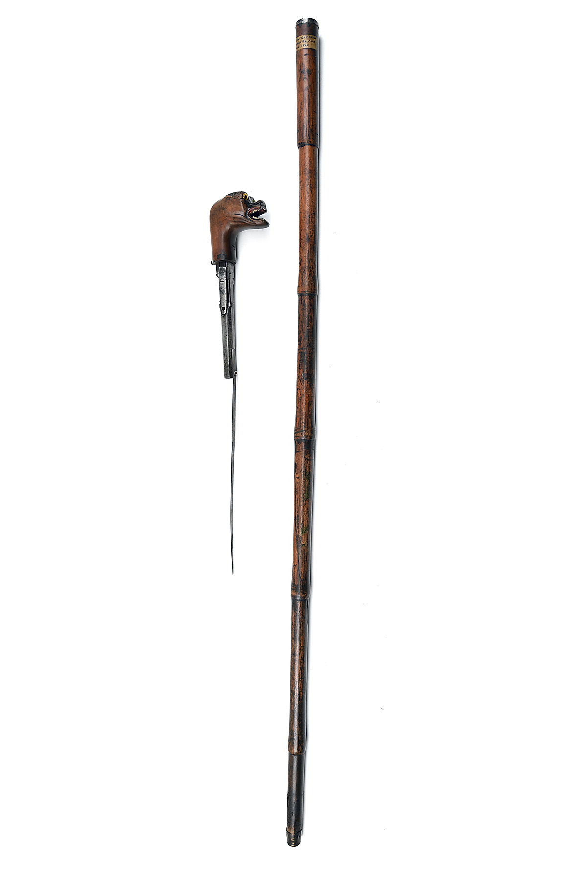 A SCARCE 7mm PINFIRE PISTOL (& DAGGER) COMBINATION WALKING-STICK, UNSIGNED, serial no. 33, Spanish circa 1895, originally with plain approximately 9in. needle-point blade mounted near the muzzle of an octagonal 2 3/4in. barrelled in-line pistol mechanism (barrel with drilled and threaded vent for blank), the rear with side-hammer, swing-open breech and side button trigger, the pommel carved as the head of a hound with open jaws and fitted with glass eyes, catch at rear to lock it into the natural cane shaft with iron mounts, the neck with old gummed label stating 'SPANISH GUN STICK PURCHASED BY JNA IN SPAIN 1898'