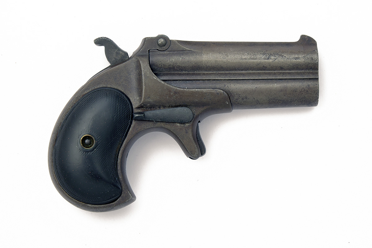 A .41 RIMFIRE OVER-UNDER DERRINGER PISTOL SIGNED REMINGTON, MODEL 'DOUBLE-DERRINGER, serial no. 119, circa 1900, with 3in. barrels signed 'REMINGTON ARMS CO. ILION N.Y.', iron frame, exposed hammer and spur trigger and chequered hard rubber grips (worn smooth, minimal traces of finish)