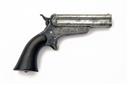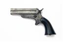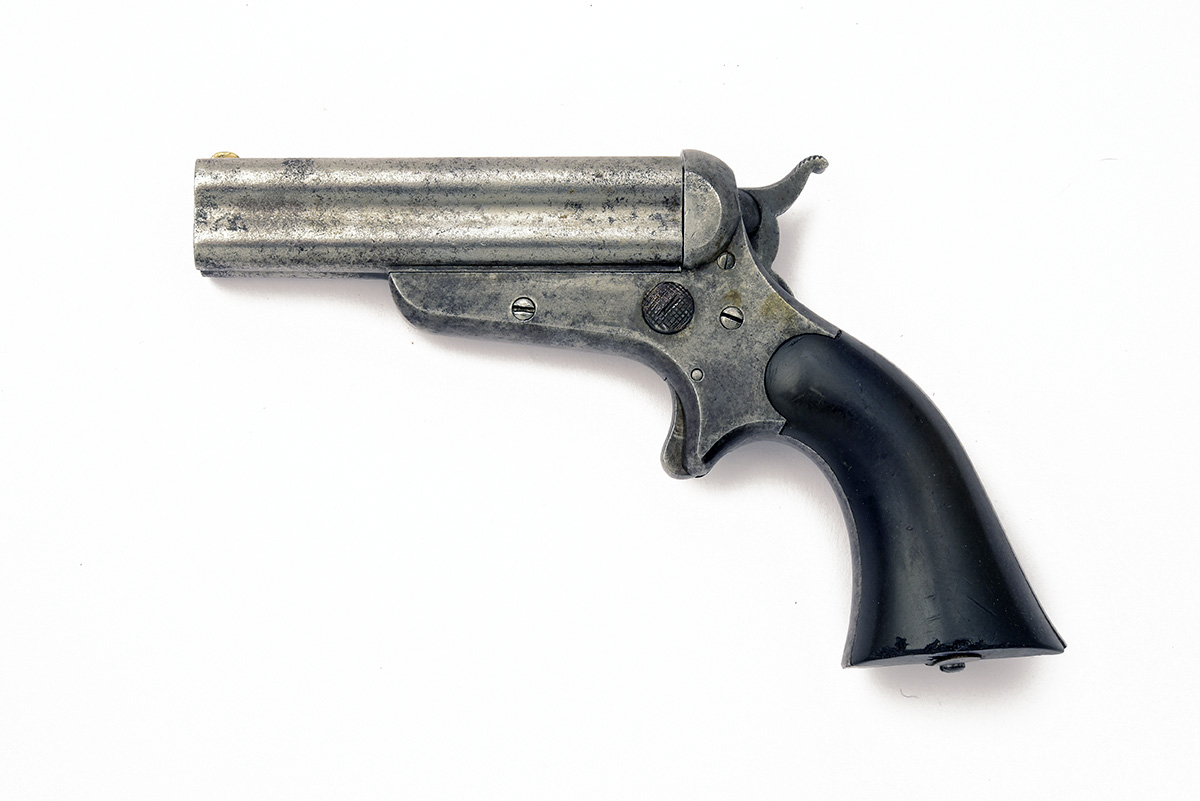 A .32 RIMFIRE FOUR-BARRELLED DERRINGER PISTOL SIGNED SHARPS & HANKINS, MODEL '3C', serial no. 3488, circa 1872, with 3 1/2in. barrel group signed 'ADDRESS SHARPS & HANKINS PHILADELPHIA, PENN.', open iron frame with button barrel release, exposed hammer (indexing system and firing pin a non functioning replacement), spur trigger and smooth flared gutta percha grips, minimal traces of finish