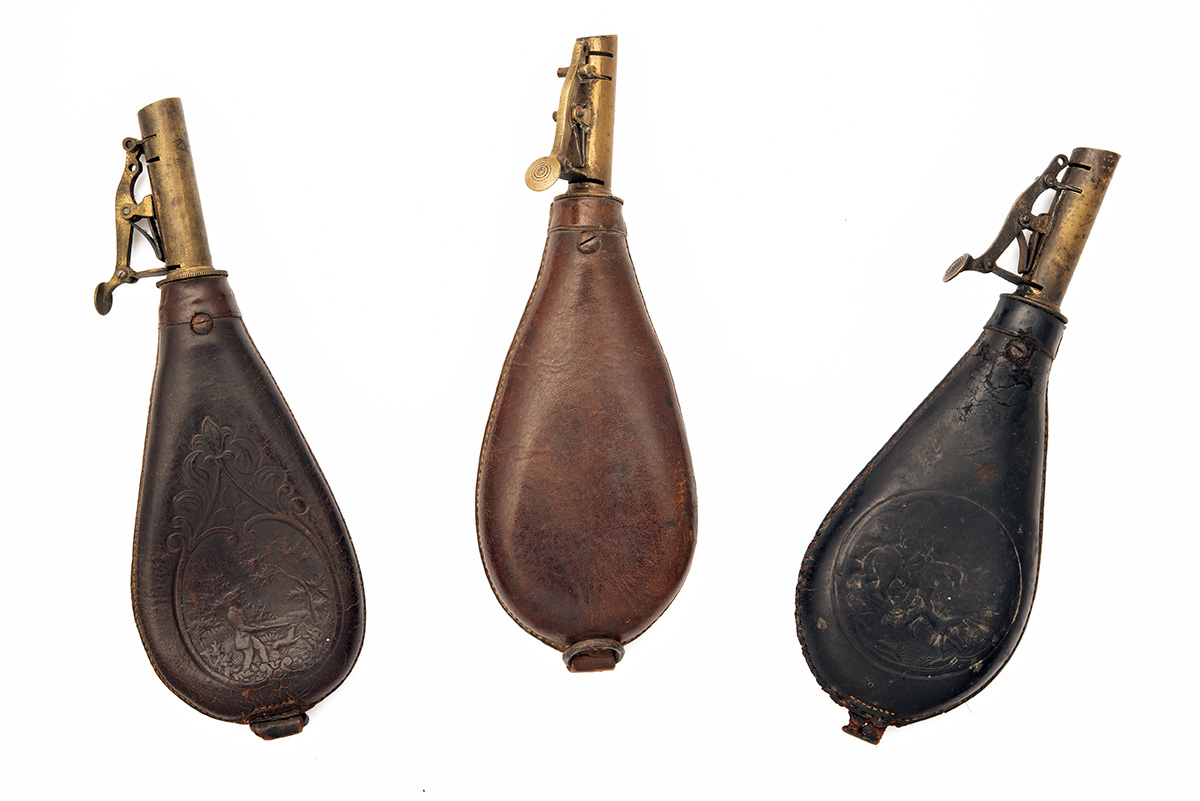 A GROUP OF THREE BETTER LEATHER SHOT FLASKS, circa 1880s, one plain brown leather, one dark brown with embossed scene on both sides, one black leather with embossed hunting scene on one side with base tab torn and missing its loop; all with fully functioning and unscrewing spouts, each 8 1/2 in. overall