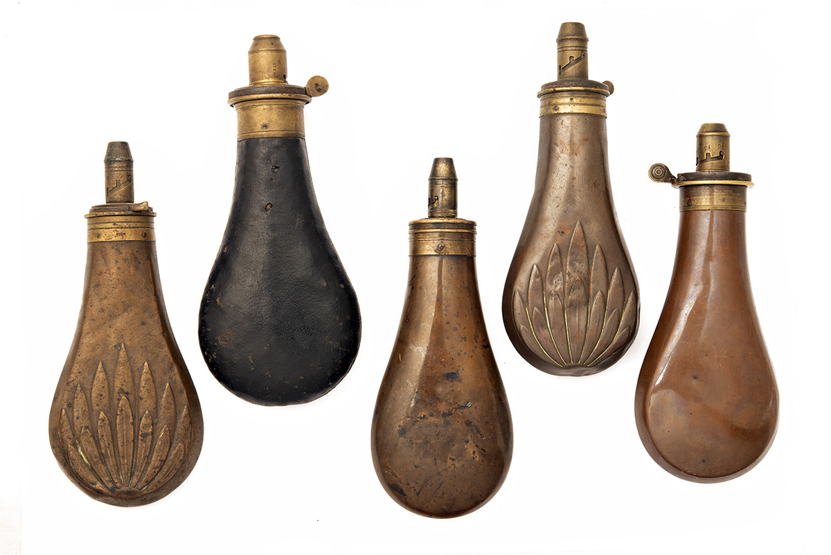 A MIXED GROUP OF FIVE SYKES PATENT POWDER FLASKS FOR SPORTING GUNS,