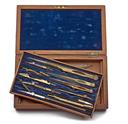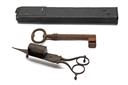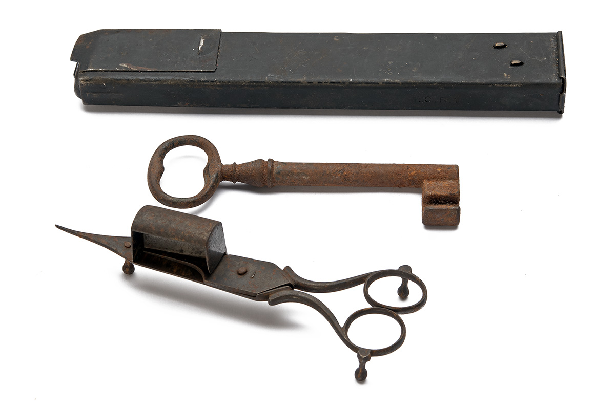 A CANDLE SNUFFER, A LARGE IRON KEY, A DRAUGHTSMAN'S BOXED SET AND A x32 ROUND MAGAZINE FOR A STEN GUN, a Victorian snuffer and trimmer; an early iron key, rusted; a mid 19th Century boxed draughtsman's brass tool set in a wooden bi-level box; a x32 round Sten Gun magazine