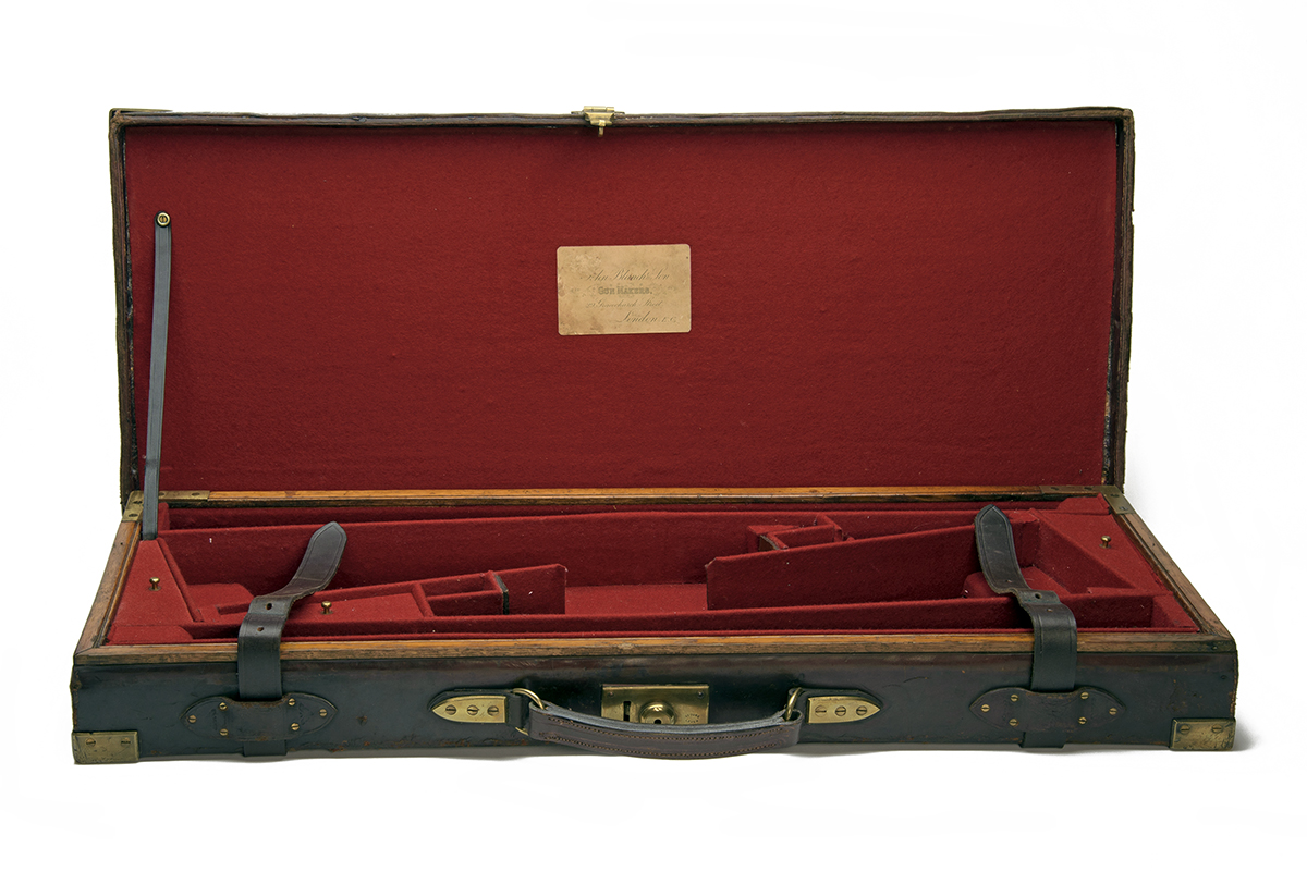 fitted for 28in. barrels (could adapt to 30in.), the interior lined with red baize, a John Blanch & Son trade label, brass lock (key missing)