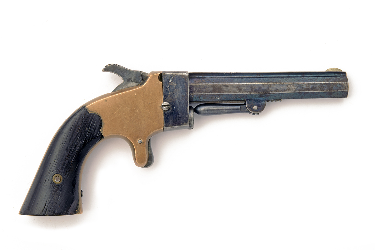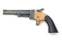 one of the last produced circa 1868, with blued octagonal 3 3/4in. barrel, raised sighting rib with nickel crescent fore-sight and signed 'E.L. & J. DICKINSON, SPRINGFIELD, MASS.', squared breech tilting sideways to load, slab-sided brass frame with exposed central hammer and spur trigger, smooth flared walnut grips (loss to toe on right hand side) and unusual rack and pinion extractor with moulded handle mounted below the barrel, strong amount of blued finish remaining