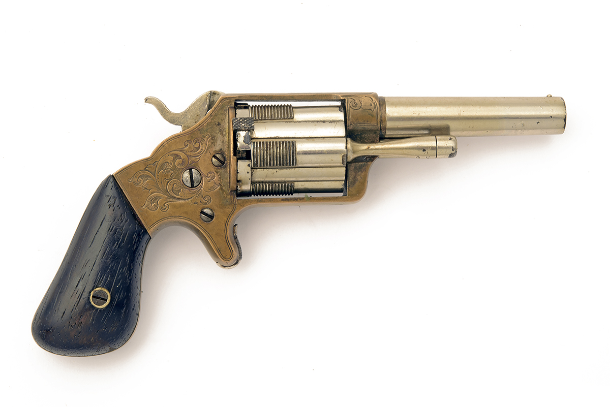 circa 1864, with nickel-plated round 3in. barrel, the top with bead fore-sight and signed B.A. CO. PATENT APRIL 14TH 1863', borderline engraved brass frame with scroll engraving to the action sides, nickel-plated cylinder with separate sliding tube chambers, fixed ejector rod and smooth semi bag-shaped walnut grips, chequered spur trigger, much plated finish remaining where appropriate